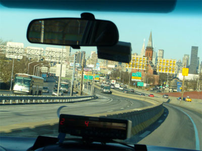 JFK(ケネディー空港)からタクシーでマンハッタンへと向う。 良く晴れたお天気が気持ち良い。 いつからか、JFKからマンハッタンまで、一律$45に なったんだね。まあ、その方が面倒がなくていいのかもしれない。 そんなわけで、朝の渋滞にちょっと巻き込まれつつ、 いざ、ニューヨークへ!!